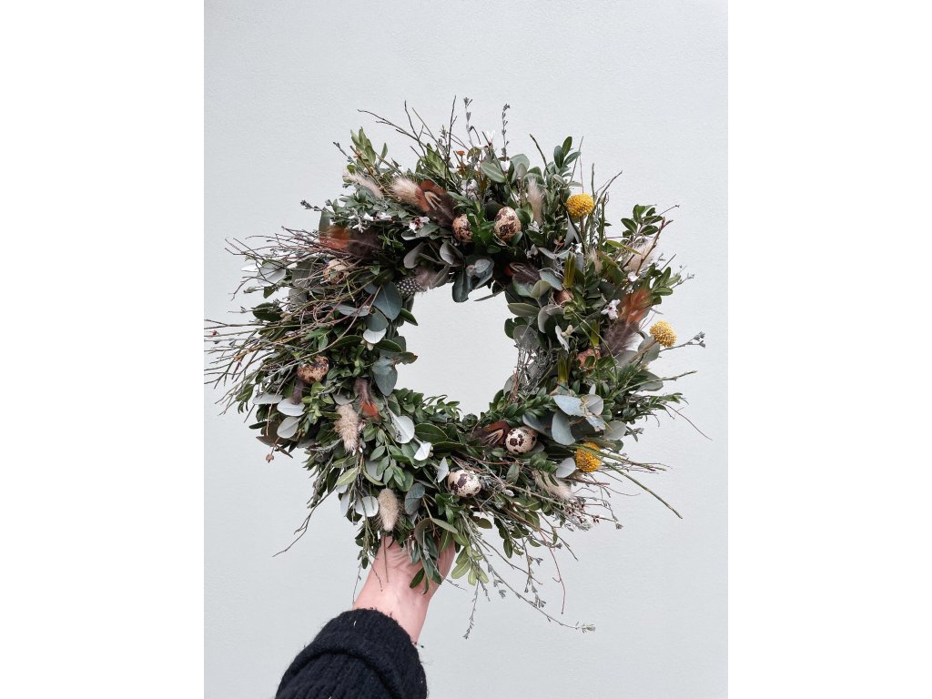 Během workshopu vás krok za krokem provedeme celým procesem výroby. Naučíte se, jak správně připravit základ věnce, kombinovat barvy i struktury a pracovat s živými i sušenými dekoracemi tak, aby věnec vydržel co nejdéle a působil harmonicky.